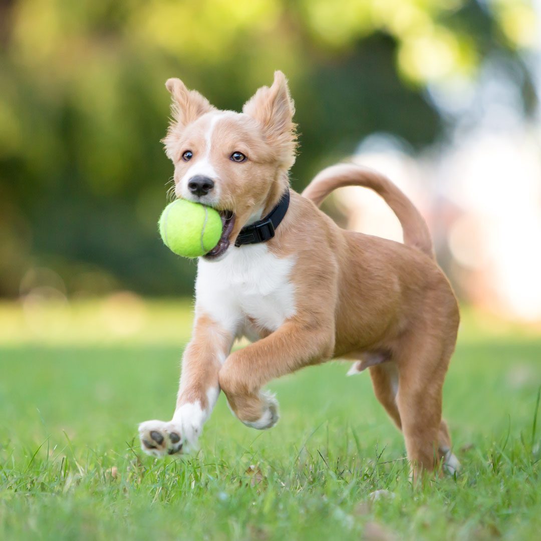brown and white puppy running through the yard with a tennis ball