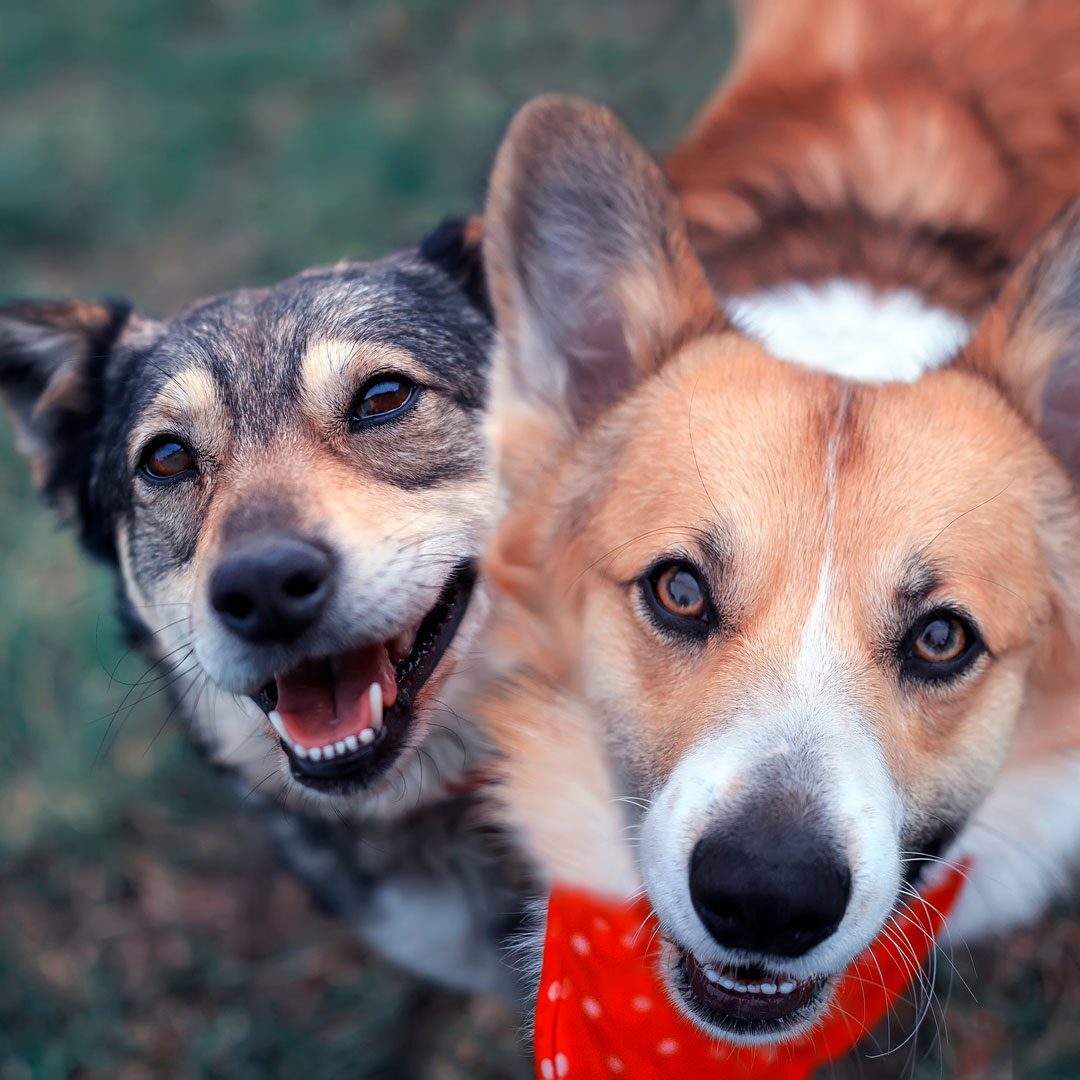 close up of two happy dogs playing outside together